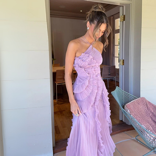 Purple Flower Layered Sleeveless Halter Neck Pleated Dress
