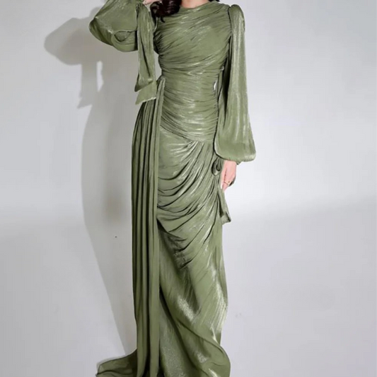 Modest Green Puff Sleeve Ruched Pleated Long Gown
