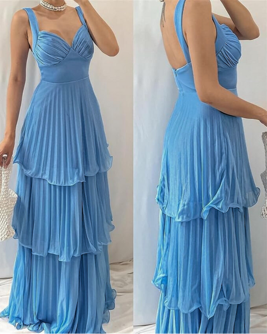 Blue Sweetheart Neck Ruffle Layered Floor Length Dress