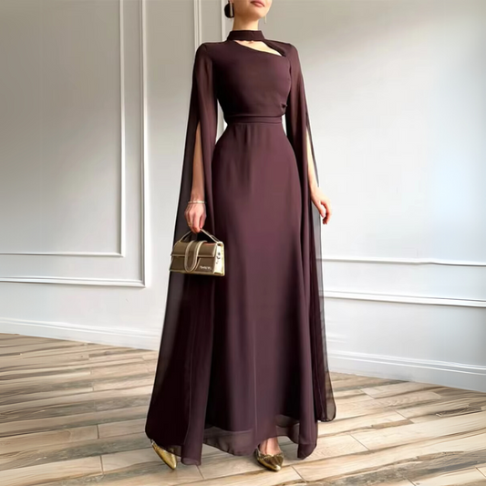 Deep Brown Halter Neck Drape Sleeves Chiffon Long Dress