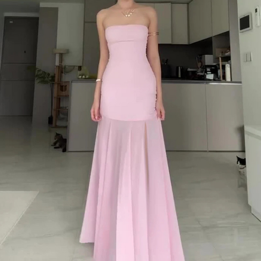 Light Pink Sleeveless Tube Neck Elegant Mesh Long Dress