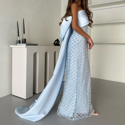 Light Blue Sleeveless Sparkly Bow Train Evening Gown