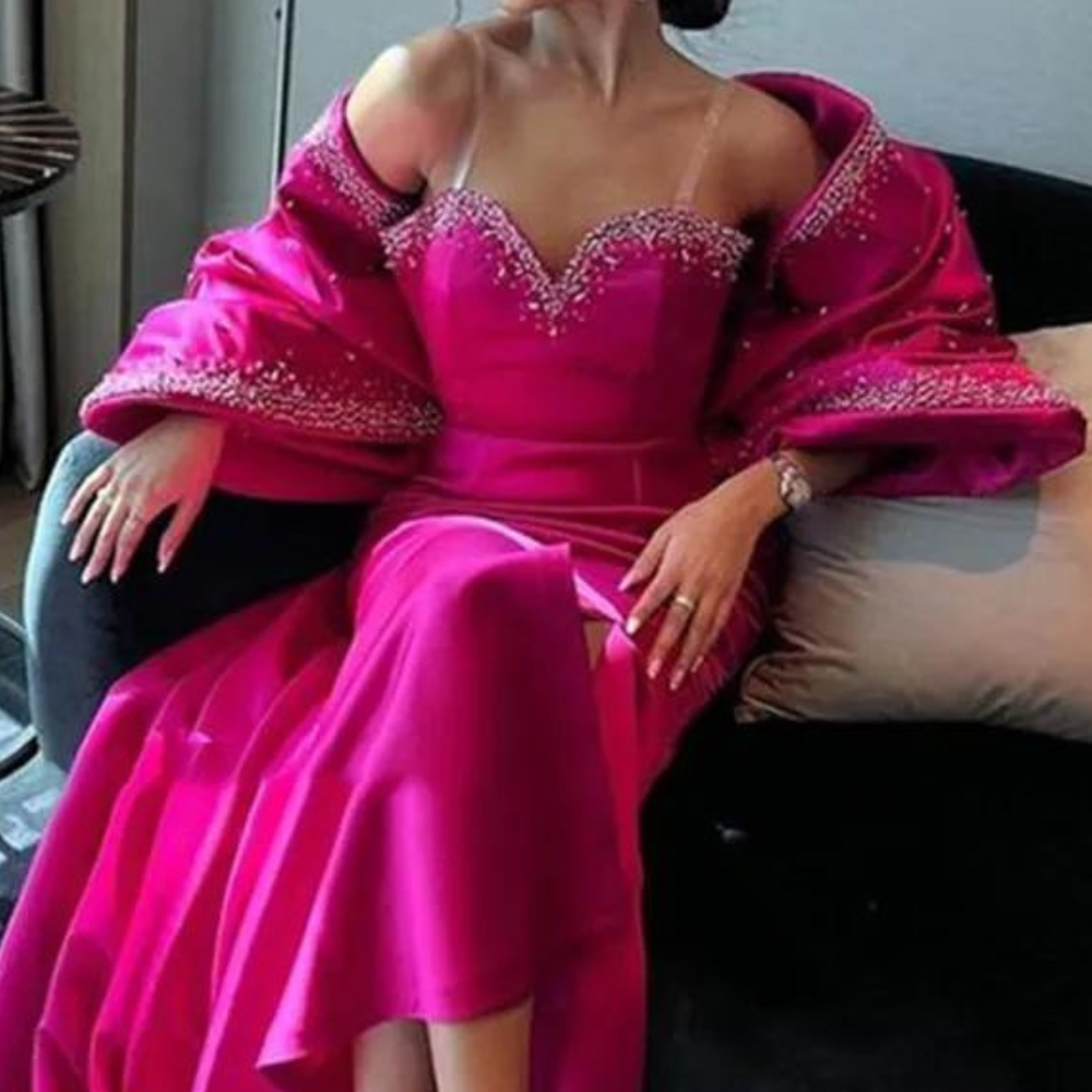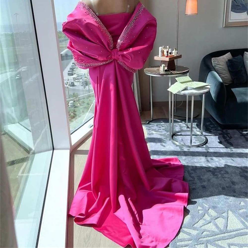Hot Pink Satin Sparkly Beaded Evening Dress