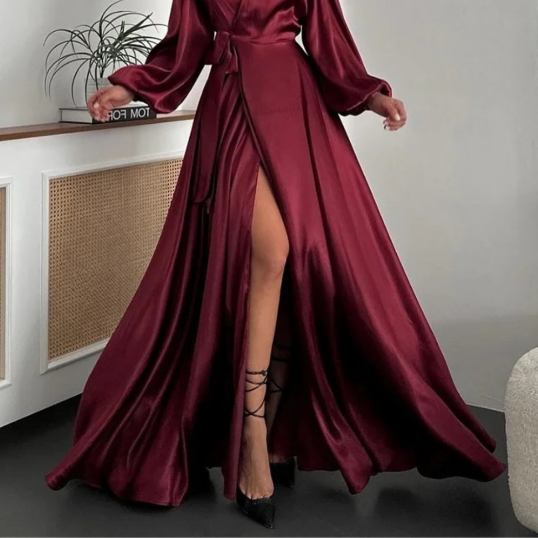 Maroon Satin Long Puff Sleeves V-Neck Wrap Long Gown
