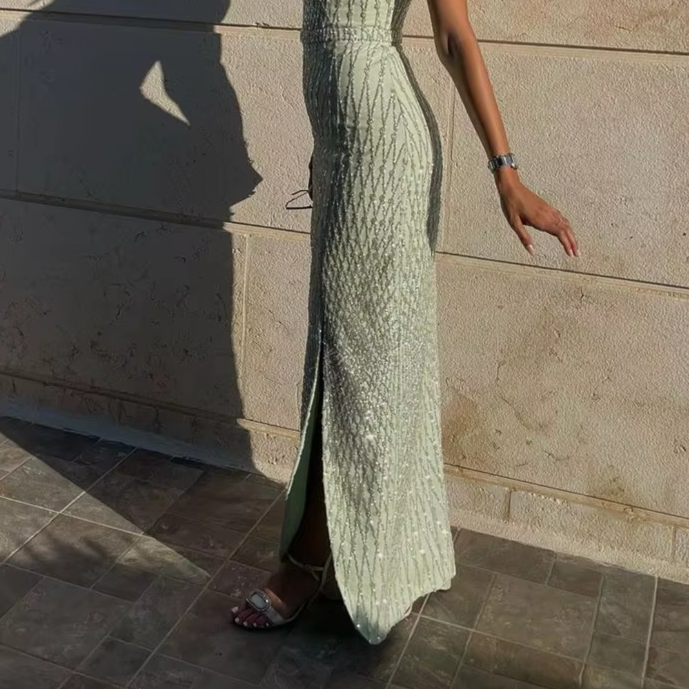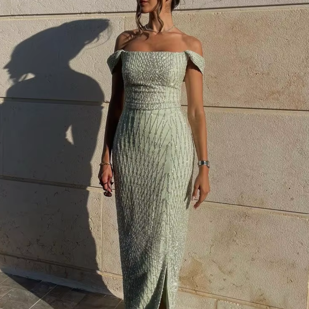 Mint Green Sparkly Sequin Off Shoulder Evening Dress