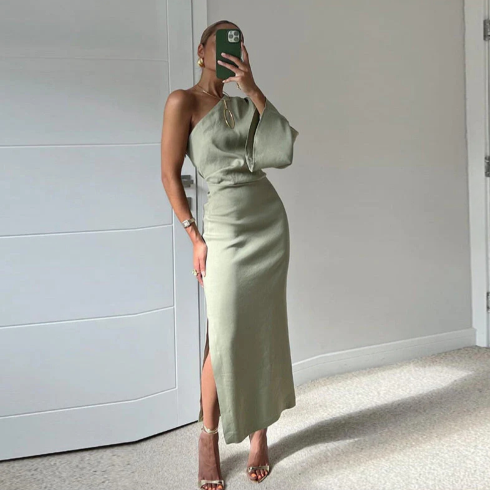 Sage Green Linen One Shoulder Flare Sleeve Midi Dress